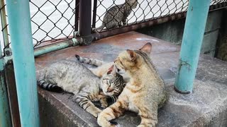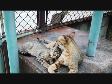 子猫の毛繕いをする母猫、そこによその子猫がやって来たら