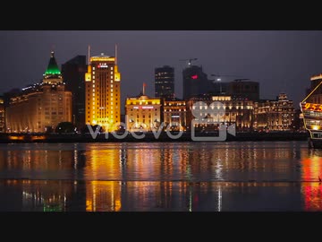 The night skyline of Shanghai China with river traffic foreground