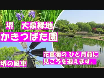 大阪 堺 大泉緑地のかきつばた園 咲き始めのかきつばた園は、GWが見ごろ。風車のある風景がすてきでした。