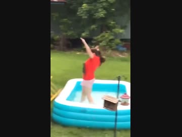 女vsプールに入り込んだリス