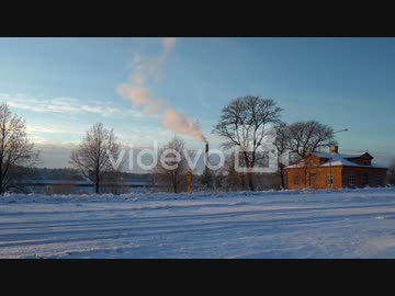 White smoke coming out of a tall chimney on a cold sunny winter while cars are driving by