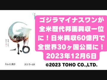 ゴジラマイナスワンが全米歴代邦画興収一位に!日米興収60億円で全世界30ヶ国公開に! 2023年12月6日