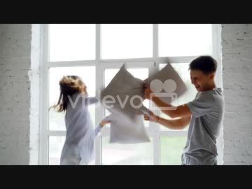 Excited young people are having pillow fight on double bed, they are having fun jumping and laughing