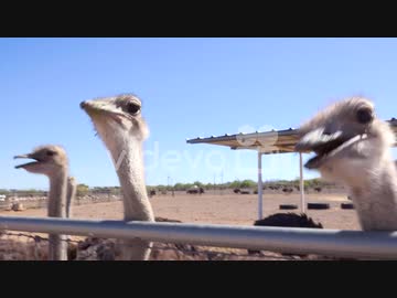 An ostrich at an ostrich farm stare and pecks at the camera