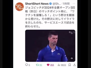 ジョコビッチが2024年全豪オープン3回戦(昨日)のマッチポイント時に、「ワクチンを接種しろ!」という野次を観客から受けた。その野次に対してイライラを示したのち、サービスエースで試合を終わらせた。