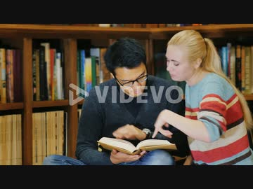Asian Man With Glasses And Caucasian Women Standing Together Watching The Book In The Library