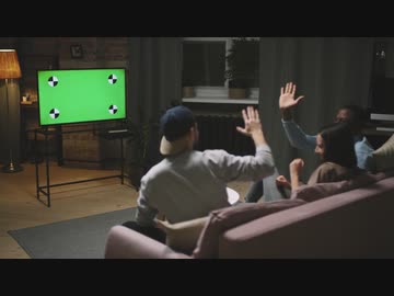 Rear View Of A Three Friends Sitting On The Couch Looking At A Screen And Celebrating