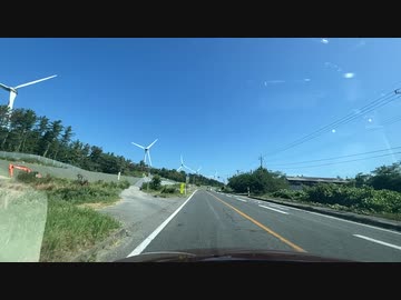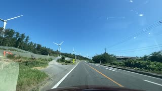 ドライブスポット 山形県酒田市の海沿い 風力発電をバックに走る2 2023 0805
