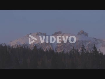 Pink sunset light on high mountain peaks with wind blowing the trees in the foreground