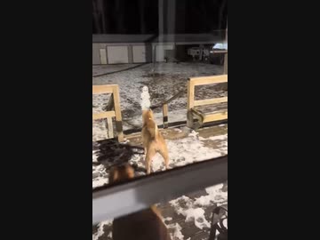 ホモと見る家の前にある雪だるまを警戒する犬