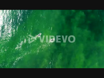 Drone aerial shot of surfer's bird's-eye view paddling in green Pacific