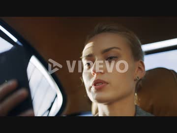Serious woman talking mobile phone at car