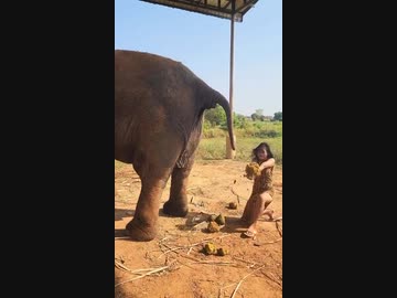ホモと見るゾウの糞でレシーブの練習をする女