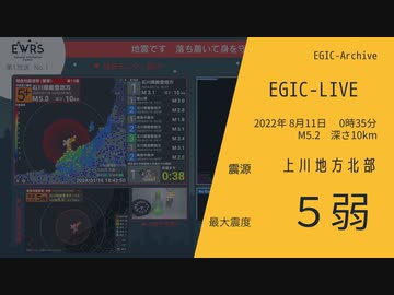 【最大震度5弱】上川地方北部 / M5.2 深さ10km / 2022年8月11日0時35分 / NBI・BISG提供