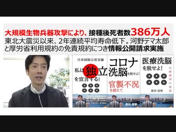 【超重要】大規模生物兵器攻撃により、接種後死者数386万人 東北大震災以来、2年連続平均寿命低下。河野デマ太郎と厚労省利用規約の免責規約につき情報公開請求実施
