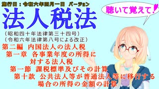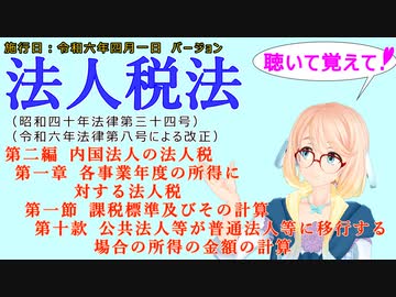 聴いて覚えて! 法人税法 第二編 第一章 第一節 課税標準及びその計算 第十款 公共法人等が普通法人等に移行する場合の所得の金額の計算 を『桜乃そら』さんが音読します。施行日 令和六年四月一日版