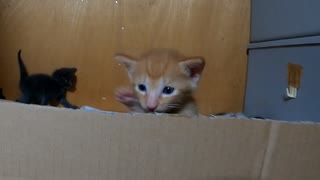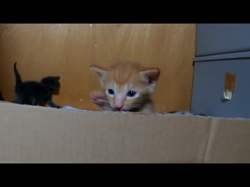 ダンボールの壁を食べようとするが食べれないと分かった子猫がこちらです