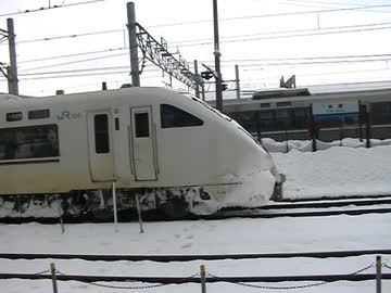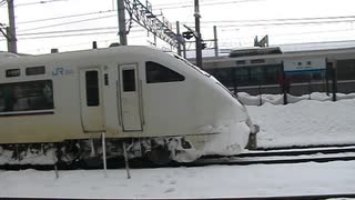 683系しらさぎ5両+3両が雪を付けながら米原駅出発