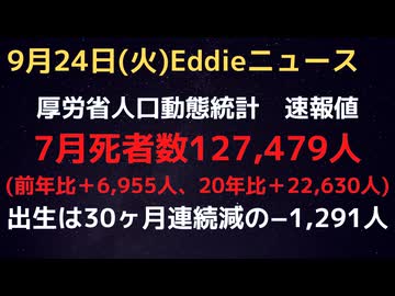 人口動態統計速報値9月発表7月分 止まらぬ人口減少!前年同月比は+6,955人、ワクチン前の2020年7月比+22,630人 出生は30ヶ月連続減の前年比−1,291人 アレの1年後から全く改善なし