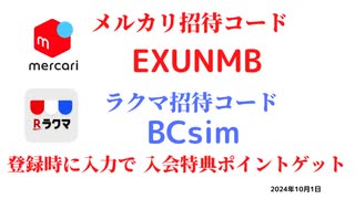 メルカリ招待コード EXUNMB ラクマ招待コード BCsim 紹介コード 友達紹介 フリマ メルカリ 2024年10月1日 メルカリ おすすめ