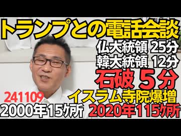 トランプとの電話会談、マクロン仏大統領とは25分、韓国大統領とは12分、石破とは5分/「ステルス侵略」20年前は15ケ所だったイスラム寺院、115ケ所に爆増していた 241109