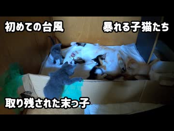 大きな台風で叔母猫が怖がる中、白目で寝る子猫がかわいい「でも母乳が飲みたい!みんなの所に帰れるのか」