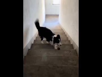 ホモと見る階段でキャッチボールする犬
