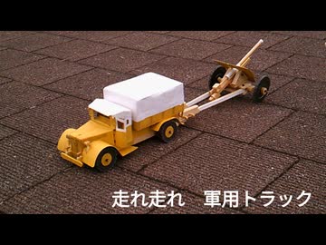 ゴム動力で走る97式自動貨車を自作して一式機動47ミリ砲を牽引した動画