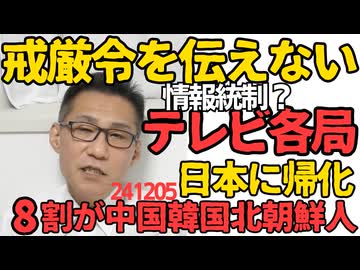 韓国戒厳令を特集しない日本のテレビ局、情報統制か外国メディアとは大違い/日本に帰化する外国人の8割を占める中国韓国北朝鮮人、地方乗っ取りも間近 241205