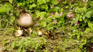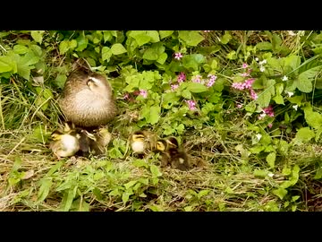 水面を走ったりジャンプする雛たちが可愛い。雛を抱く母カモ。