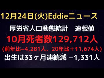 人口動態統計速報値10月分発表 死亡数前年同月比はー4,281人、アレ前の2020年10月比+11,674人 減少は秋からのアレ回避原因か 出生は32ヶ月連続減の前年比−1,331人 改善は見られず