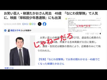 じゃねーだろ お笑い芸人・柳瀬たかおさん死去 49歳 「なにわ突撃隊」で人気に、映画『岸和田少年愚連隊』にも出演