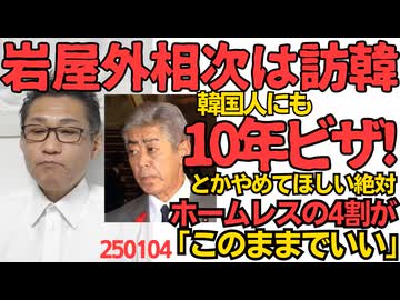 岩屋外相、次は訪韓「韓国人にも10年観光ビザ!」とかやめて絶対欲しい 今の混乱した韓国に行って誰と何を話すのか/ホームレスの4割「今のままでいい」救済や自立を求めていない 250104
