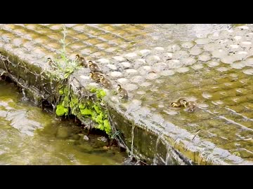 怖いけど勇気を出して飛び込むカルガモの雛鳥たち