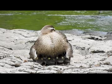 寝ているカモ親子に別のカモ親子が接近!