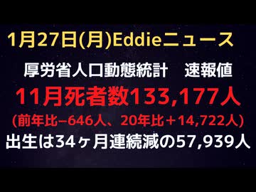 人口動態統計速報値11月分発表 人口減継続!死亡数前年同月比はー646人、アレ前の20年10月比+14,722人 高止まりもほとんど減らず 出生34ヶ月連続減の57,939人 やはり出生にもアレ影響か