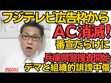 フジテレビ広告からACも消滅!番宣だらけに 番宣して番組を見てもらっても広告付いてないから金にならないのにw/兵庫県警が竹内県議をネットで組織的に誹謗中傷した投稿者の捜査を開始 250202