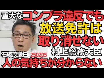 村上総務大臣「重大なコンプライアンス違反があってもテレビ放送免許は取り消せない」じゃ何なら取消なの?/石破茂「総理やってると世間が何を考えてるのか分からなくなってくる」何なら分かるのw 250205