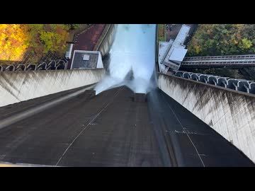 紅葉時の宮ヶ瀬ダムの上から観光放流