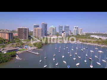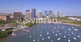 Aerial follow jet ski into harbor full of boats