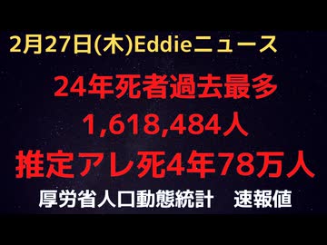 人口動態統計速報値 24年12月分発表 24年年間1,618,484人死亡は過去最多 12月は前年同月比−10,472人とまた大幅増加! 出生も減少で推計超過◯亡はアレ開始後4年で推計78万人!