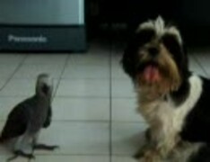 オウムに襲われる犬