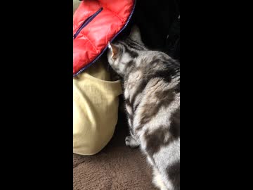 母の服の中に入っていく猫。