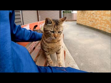 タバコ屋のベンチにいた野良猫をナデナデしたら、まさかの展開に…!【膝乗り猫】