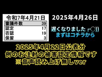 ◆遅くなりました┏○)まずはコチラから2025年4月22日公表分例のお注射の被害認定情報です※音声読み上げ無しver