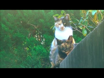 母のサビ猫と並ぶ三毛猫
