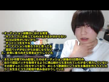 めじろうの嘘「Kickに命を捧げられないんだよ…キッカーズオーディションに本気で臨んだのに…バカじゃん!」 ※全くKickもせず、オーディションを断ろうともしていた。不合格になって急にキレていて困惑