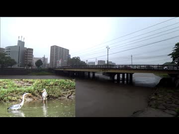 ある梅雨空の~増水してきた甲突川と,妙な緊張感漂よわせてるアオサギ2羽。市電やバスや車・トラックなどなどの行き交う武之橋,といきなり雨