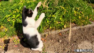 ススキとじゃれ合う白黒猫