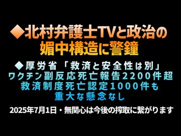 ◆北村弁護士、テレビと政治の媚中構造に警鐘◆厚労省「救済と安全性は別」ワクチン死亡報告2200件、死亡認定1000件も重大な懸念なし